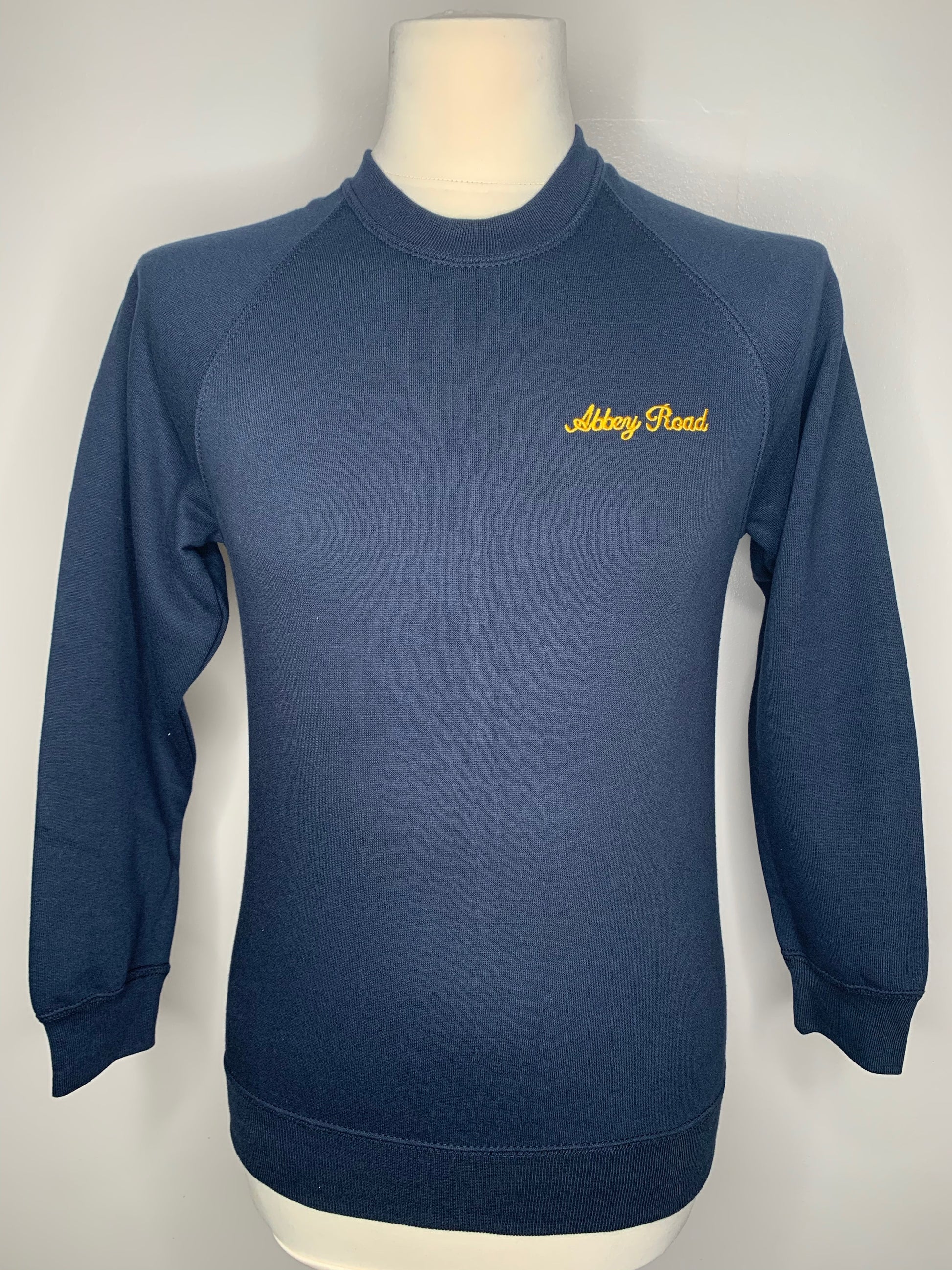 Navy. Embroidered logo. Iconic school sweatshirt. Twin needle coverseams on neck. Raglan sleeve cuffs and waistband for extra durability. Herringbone back neck tape. Spotshield stain resistant coating for fabric protection. Fade resistant.